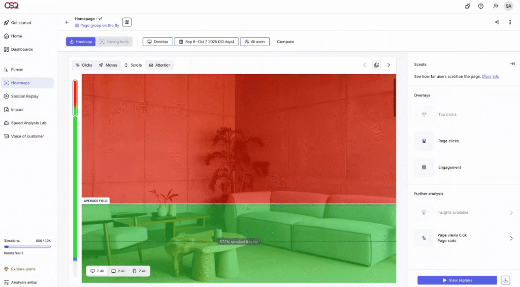 Hotjar’s heatmaps let you instantly see where users click, scroll, and linger on your pages — highlighting high-engagement zones and dead spots.